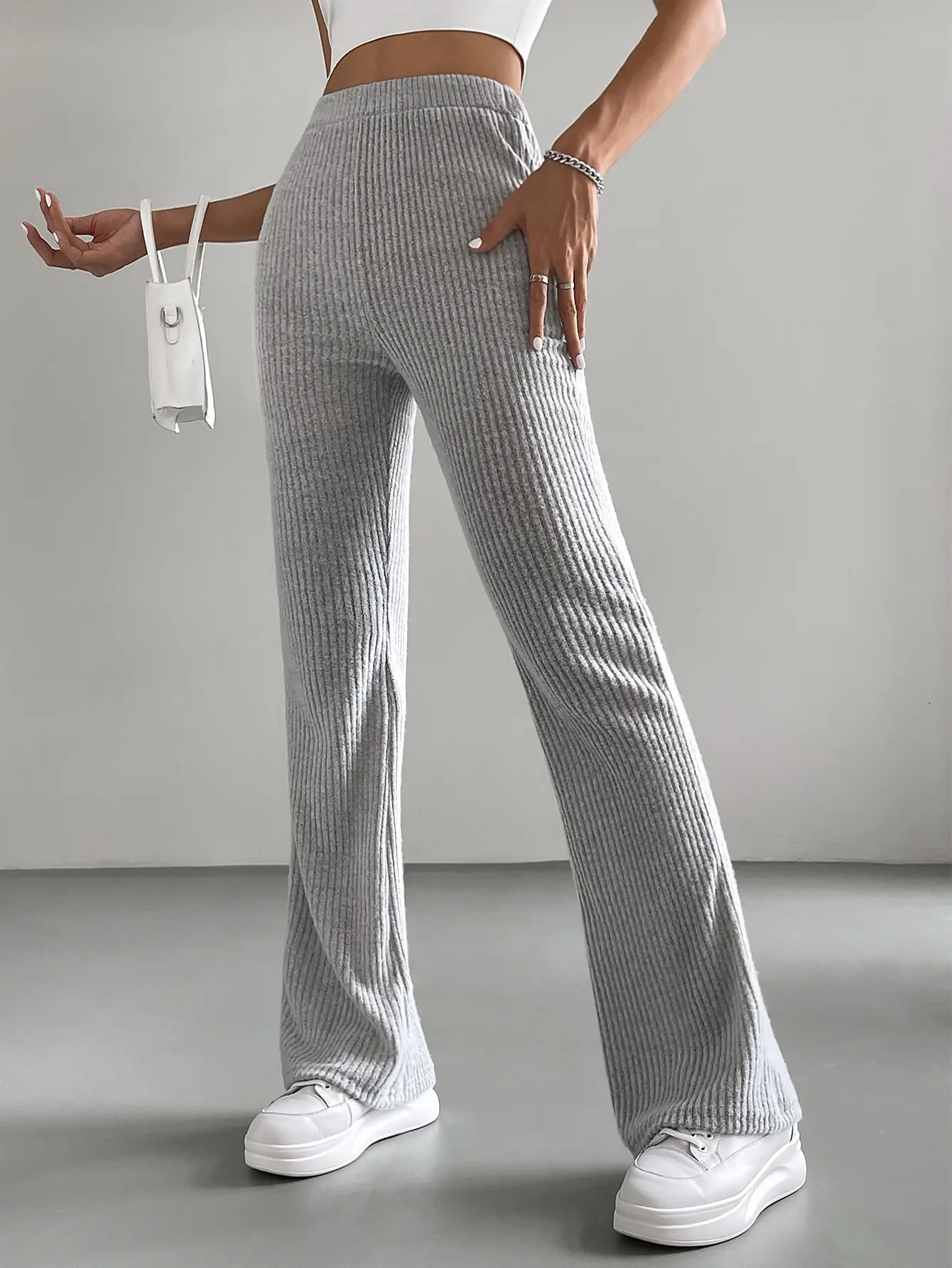 Wholesale Hot Sale Plain High Waist Custom Slim Fit Women's Flared Pant Ribbed Knit Flare Leg Pants
